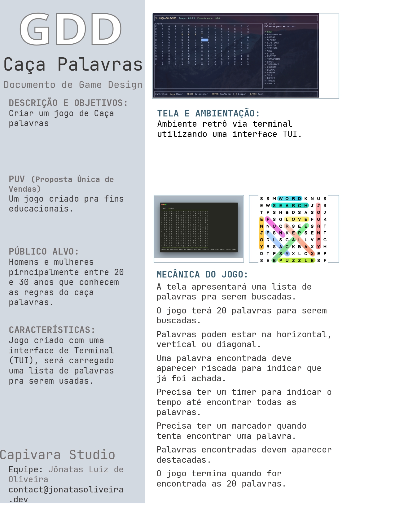 A tela apresentará uma lista de palavras pra serem buscadas. O jogo terá 20 palavras para serem buscadas. Palavras podem estar na horizontal, vertical ou diagonal. Uma palavra encontrada deve aparecer riscada para indicar que já foi achada. Precisa ter um timer para indicar o tempo até encontrar todas as palavras. Precisa ter um marcador quando tenta encontrar uma palavra. Palavras encontradas devem aparecer destacadas.O jogo termina quando forem encontradas as 20 palavras.